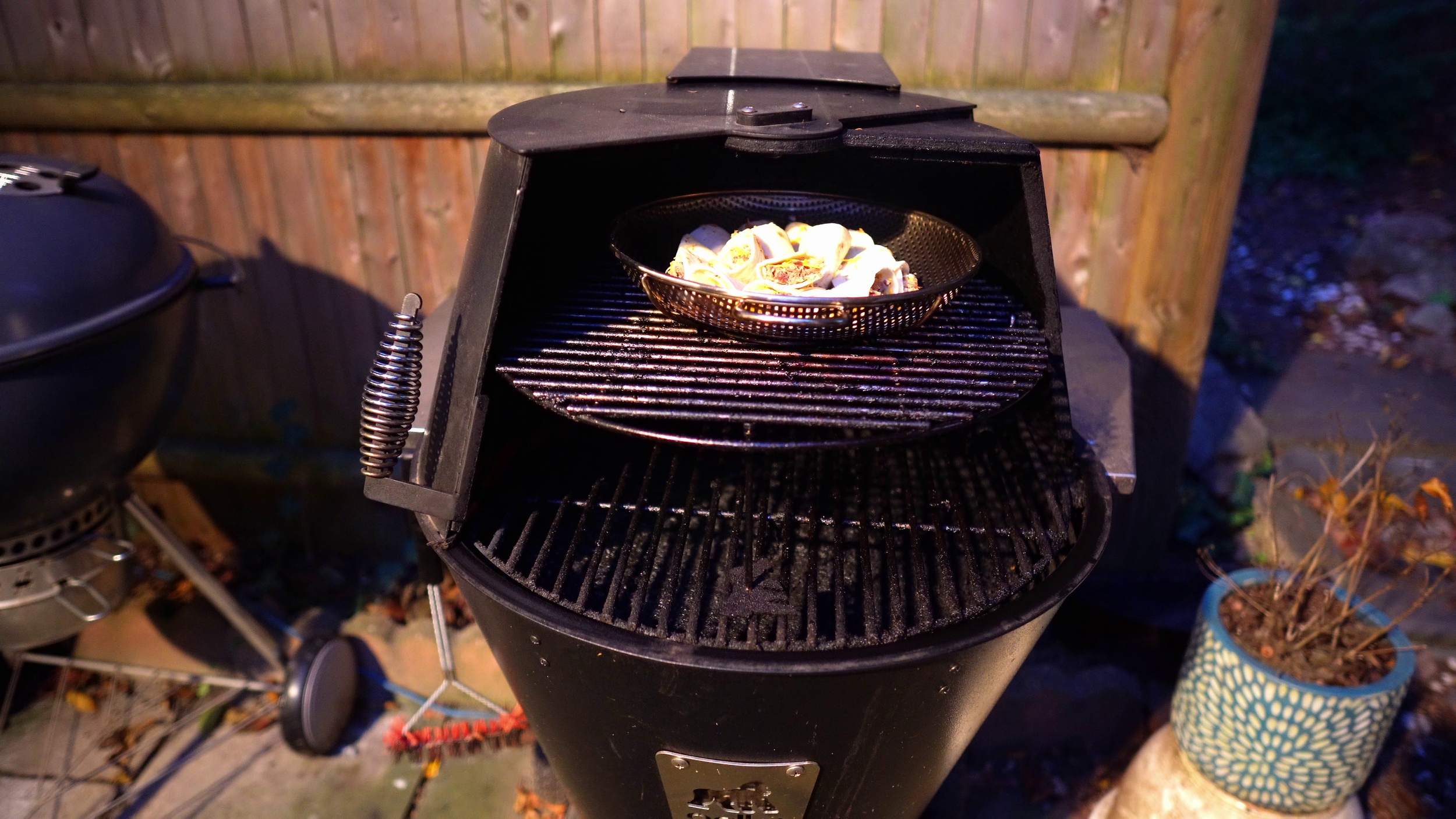 Smoke at 180 (for the most smoke) until the filling is warm and the cheese is melted.